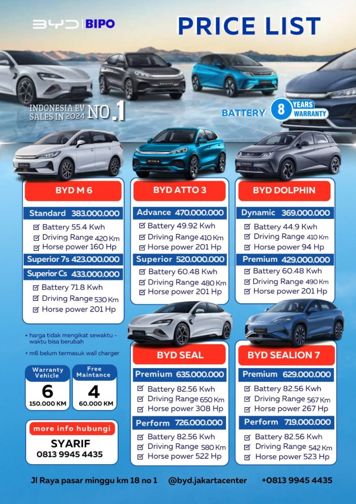 BYD ATTO 3 Crossover listrik gagah dan cocok untuk berpetualangBYD ATTO 3 Advance Rp 465.000.000 Jarak tempuh Baterai : 410 km Kapasitas Baterai : 49.92…